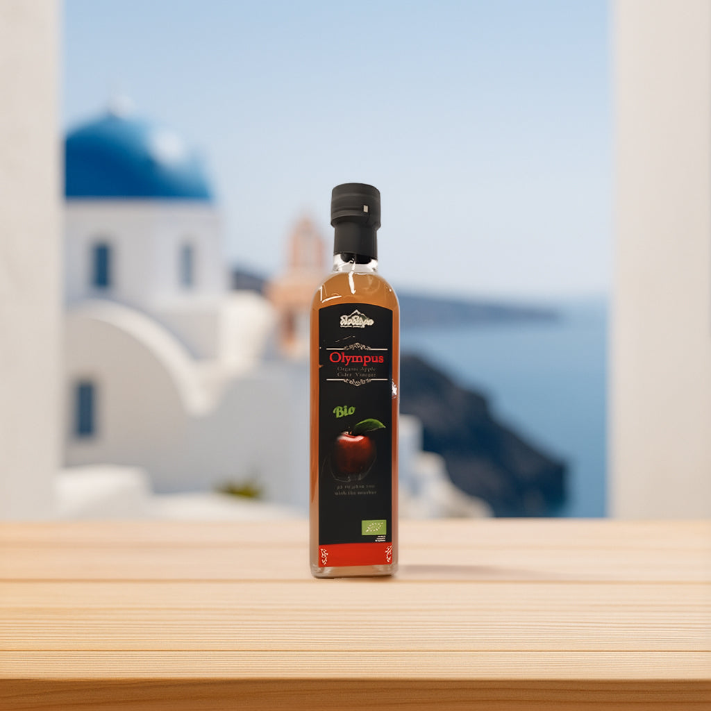 Organic Greek Apple Cider Vinegar with the Mother, 500 ml (17 fl oz). Raw, unfiltered, and alive with probiotics—crafted near Mt. Olympus for wellness and Mediterranean cooking.
